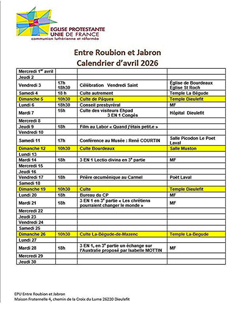Pour toutes autres renseignements sur les cultes, contacter Catherine Cadier 06.88.41.99.76
