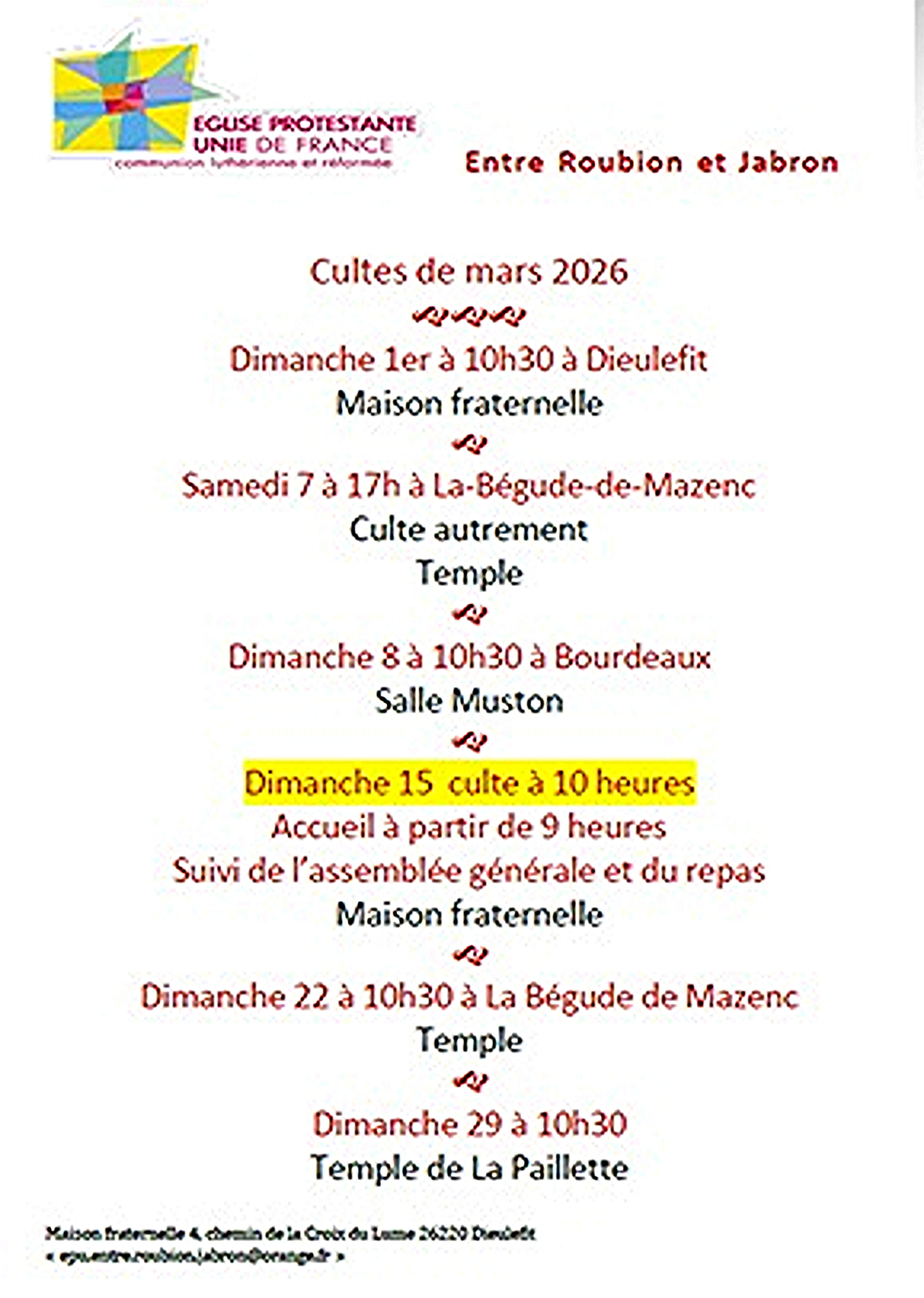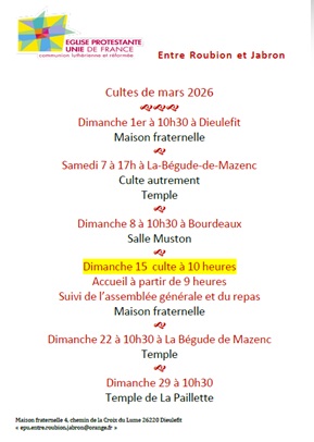 L’Assemblée Générale de la paroisse aura lieu le DIMANCHE 15 MARS (jour des Elections Municipales !) à la Maison Fraternelle de DIEULEFIT.